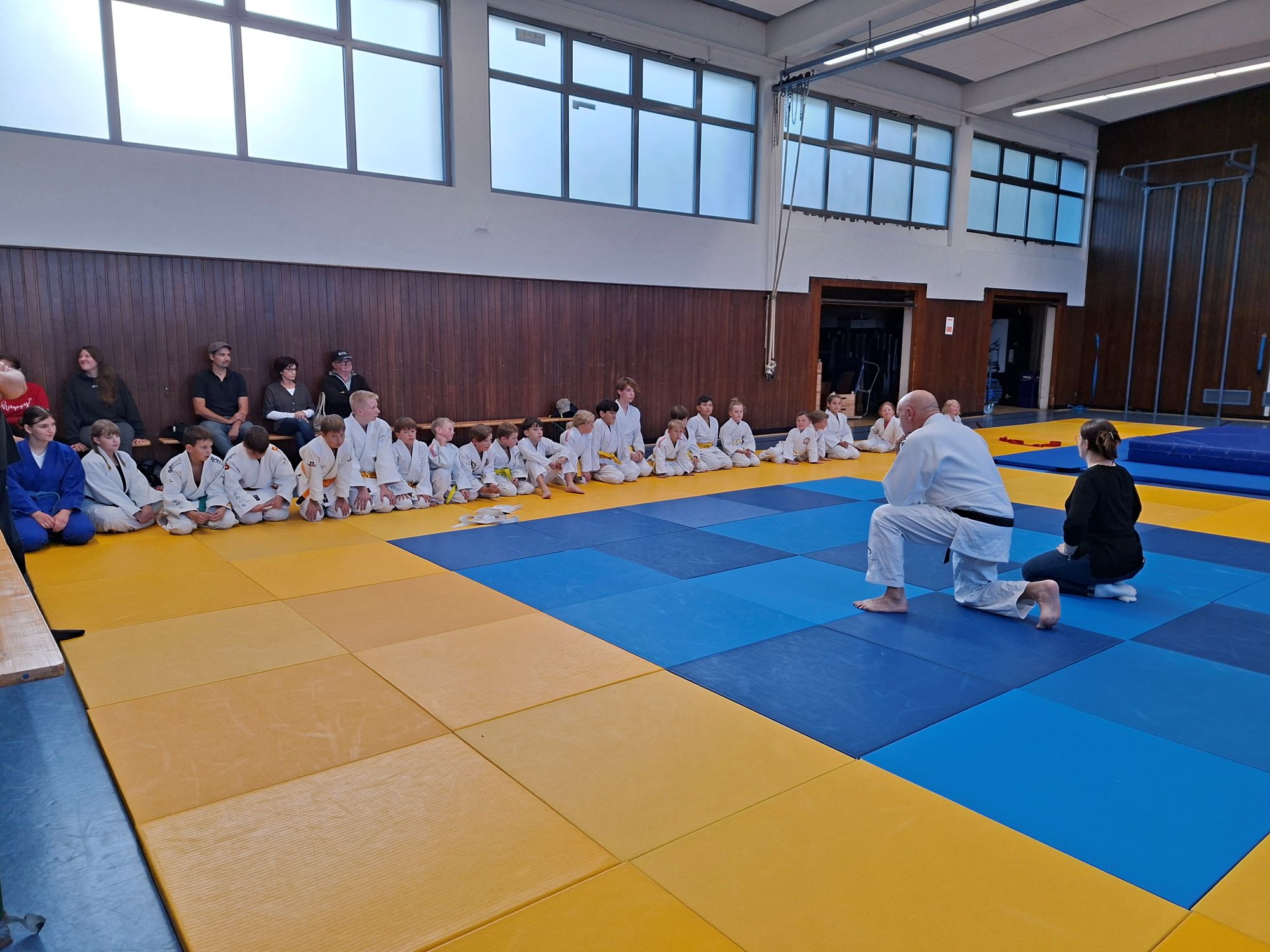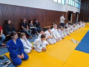 Am Prüfungstag war die Spannung der Kandidaten und ihrer mitfiebernden Zuschauer – Eltern, Geschwister, Trainingskameraden und Freunde – deutlich spürbar. Obwohl die Anwärter auf Gürtel bis orange (5. Kyu) zu diesem Zeitpunkt die meisten Prüfungsaufgaben (Fall-, Wurf- und Bodentechniken) trainingsbegleitend bereits absolviert hatten, wollten sich alle bei den noch zu zeigenden Randori-Aufgaben in Bestform präsentieren, was auch eindrucksvoll gelang.