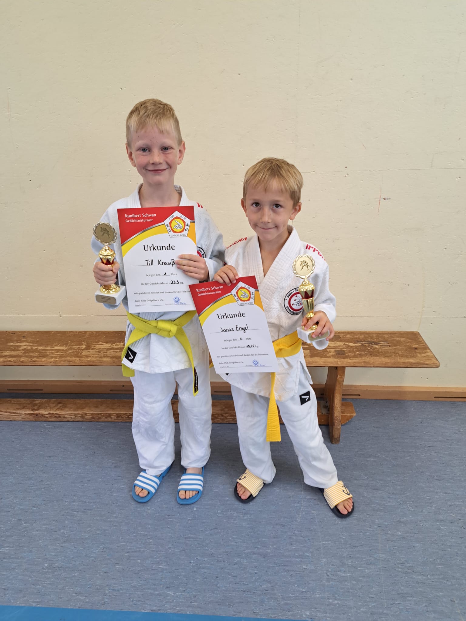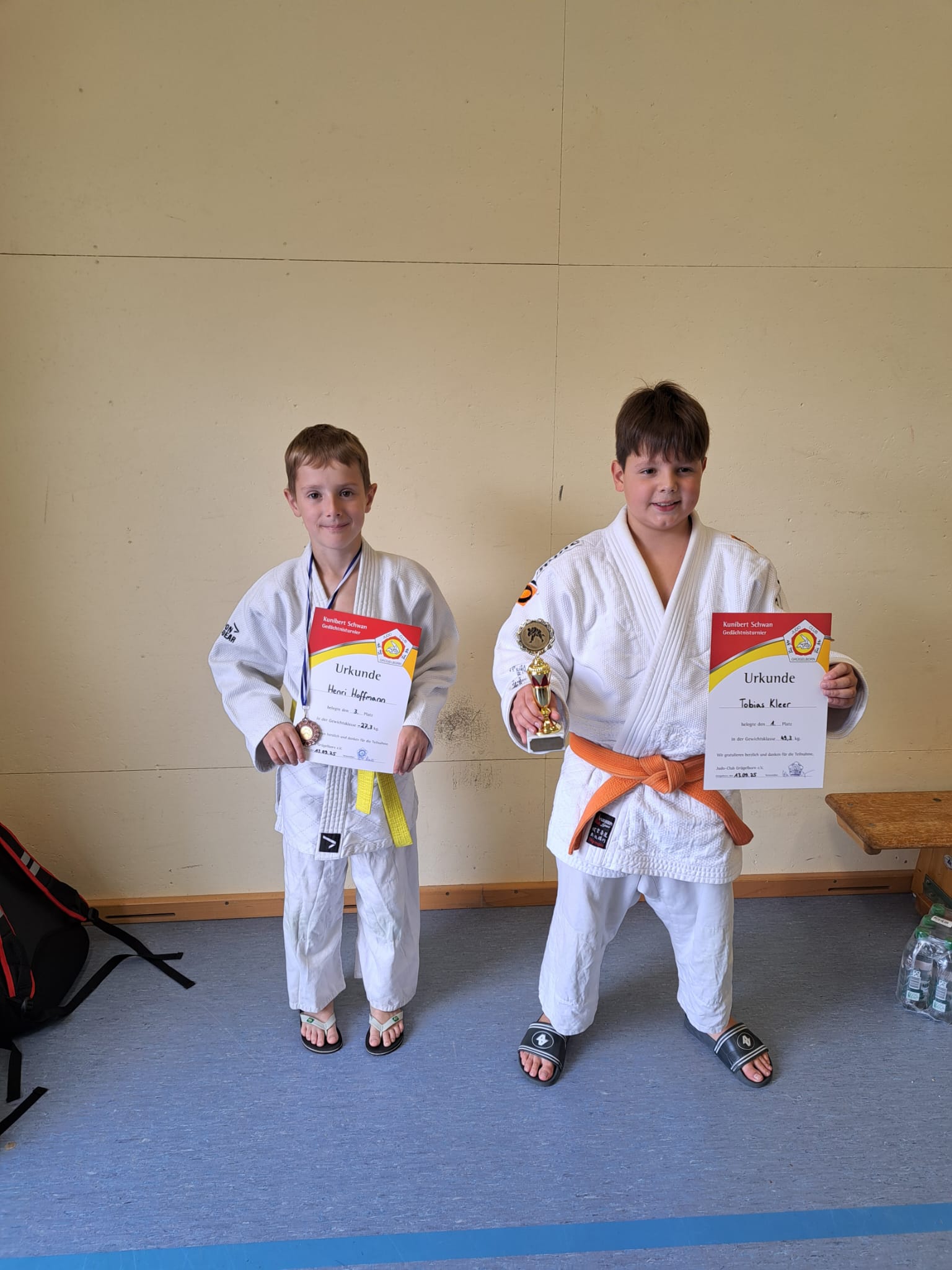 Grügelborn. Das Kunibert-Schwan-Gedächtnisturnier des Judo-Clubs Grügelborn fand Mitte September zum 9. Mal statt. Die mutigen Judo-Anfängerinnen und -Anfänger der U9 (bis gelber Gürtel), U11 (bis oranger Gürtel) und U13 maßen sich miteinander in gewichtsnahen 5er-Pools im Modus Jeder gegen jeden. Vom JCU kämpften Till Krauß-Naumann, Jonas Engel, Henri Hoffmann und Tobias Kleer.